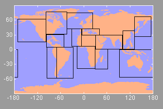 The utility includes a coarse resolution coastline. For reasons of memory management only sections of the world ocean's coastline can be plotted at any one time. Select a region from the map. (Plotting the coastline is memory-intensive. It is recommended to close all other applications before plotting.)