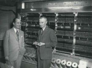 The mathematician John von Neumann, consultant to the EDVAC project, and the nuclear physicist Robert Oppenheimer in front of the EDVAC.